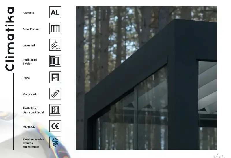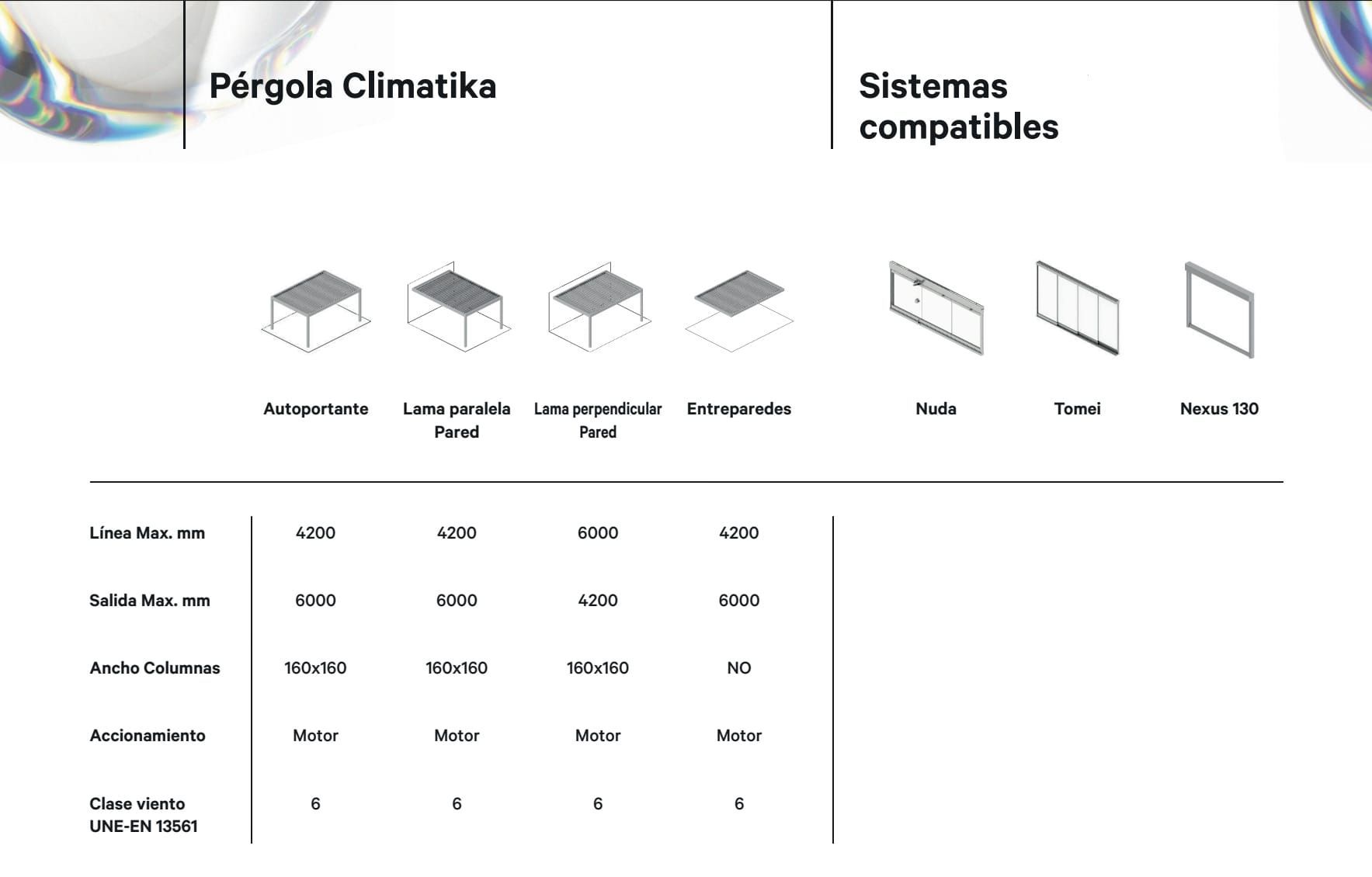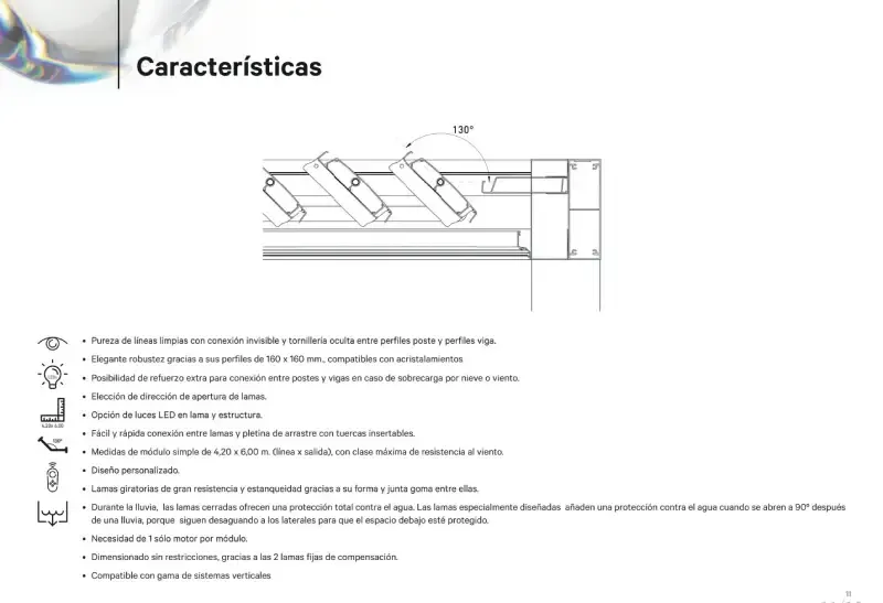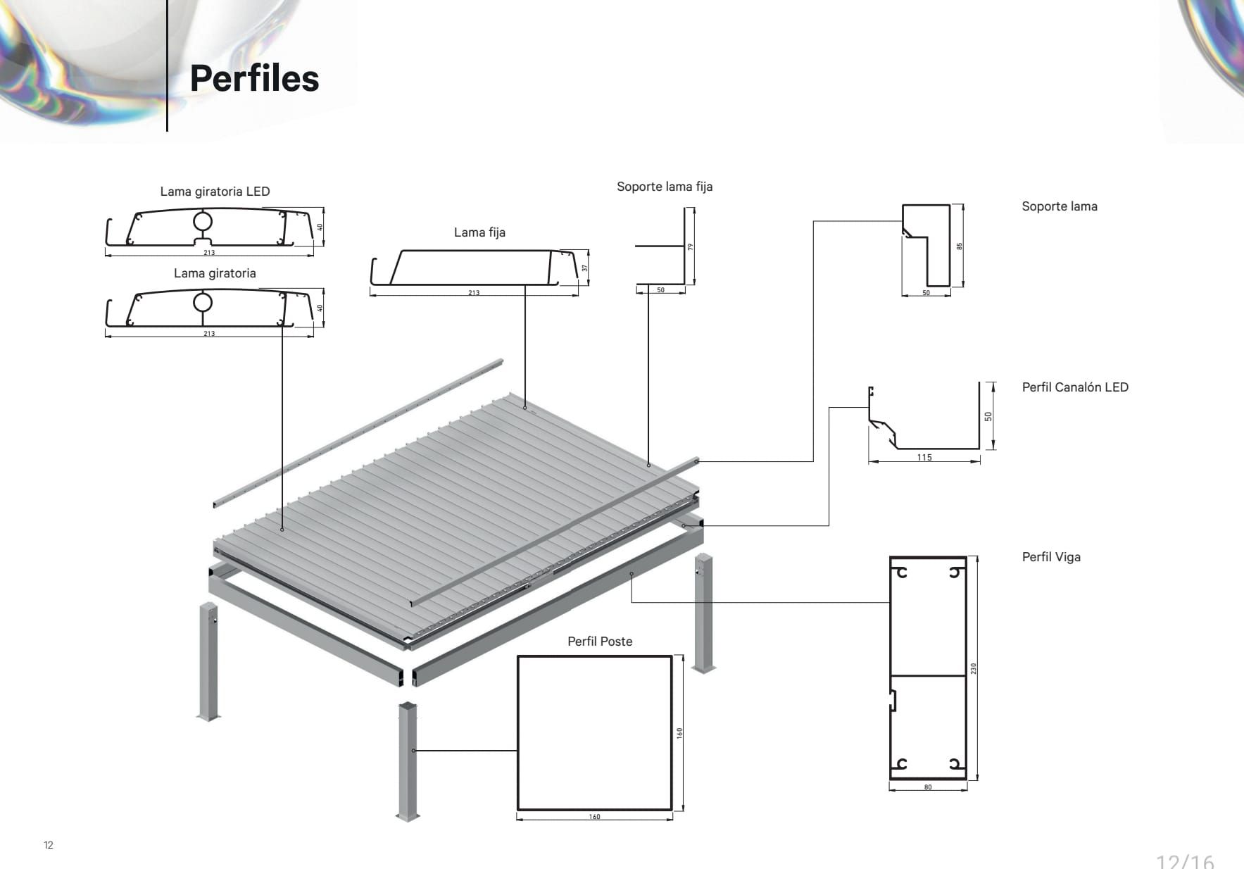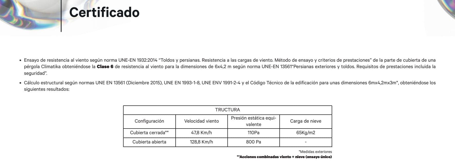 - Pergola certified in its maximum dimensions, determining the maximum load at 1.5 kN/m2.