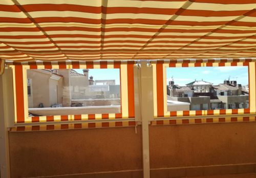 A window curtain is a type of cover or screen that features one or more transparent openings or windows (usually made of plastic or vinyl) integrated into its design. These windows allow visibility and air circulation while providing protection from rain, wind, or sun.
